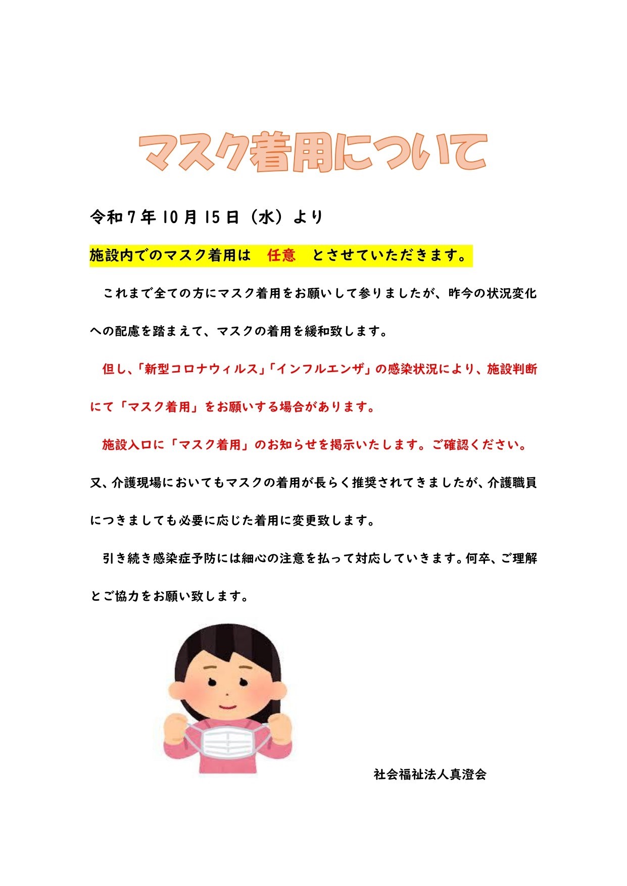 令和7年10月15日(水)より、加島の郷拠点とディアナの郷拠点において施設内のマスク着用は原則任意とさせて頂きます。但し、「新型コロナウィルス」「インフルエンザ」の感染状況により、施設判断にて「マスク着用」をお願いする場合があります。